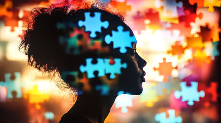 A silhouette captures the complexity of identity, merging with colorful puzzle pieces that symbolize thought and creativity in a striking manner.