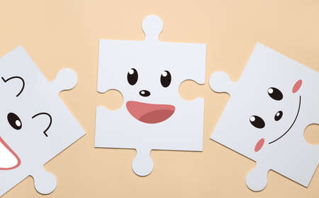White puzzle pieces with different drawn emoticons on beige background