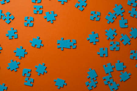 Bunch of puzzle pieces lying on a paper blue background