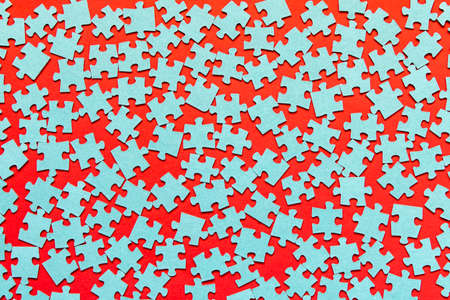 Puzzle. Many puzzle pieces on a red background. The concept of collective thinking