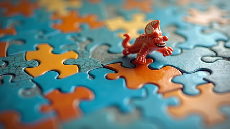 An orange dinosaur toy standing on jigsaw puzzle, representing problem solving, creativity, fun, and connection, ideal for childhood, games, and educational concepts.