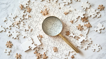 A magnifying glass rests on scattered puzzle pieces on a beautifully veined marble surface. The image captures the themes of curiosity and exploration, emphasizing detail and focus in a creative or problem-solving context.