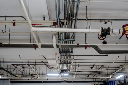 Electric cable and pipe on the ceiling