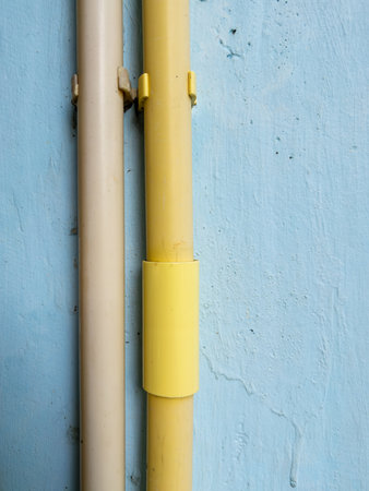 Minimalism style, Blue water pipe on yellow wall texture background.