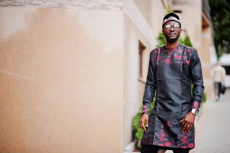 Handsome afro american man wearing traditional clothes, cap and eyeglasses in modern city.