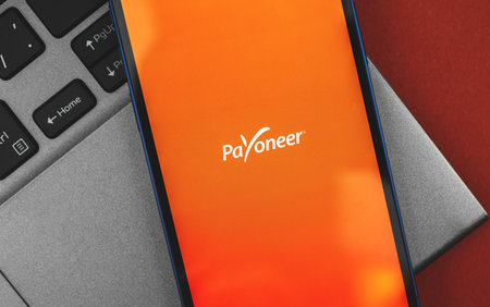 Montreal, Canada - February 3, 2021: Payoneer logo on a cellphone over a stock chart. Payoneer is financial company that provides online money transfer and digital payment services.
