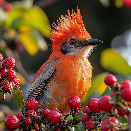Brightly colored orange bird with a striking crest, sitting among vivid red berries, surrounded by lush foliage in soft light, showcasing the beauty and diversity of nature through vibrant detail.
