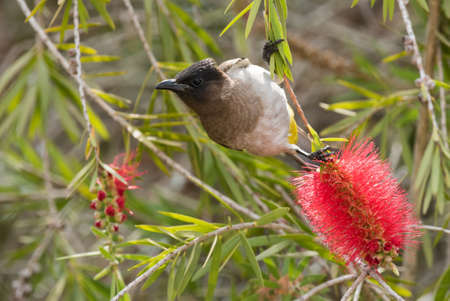 Black-eyed bulbul Pycnonotus barbatus hanging from a bottle brush flower
