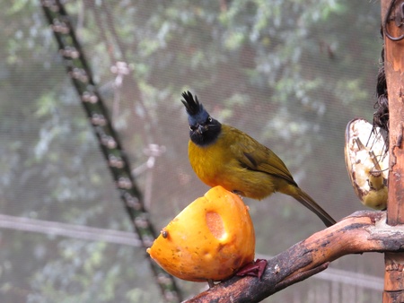 Black-crested bulbul (Pycnonotus flaviventris) lovely yellow with black crested bird about to swim in the jar pool