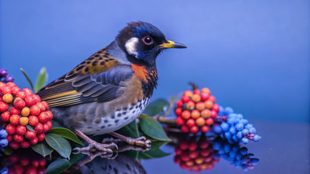 A colorful bird with a yellow beak perched on a branch with red berries and green leaves against a blue background.