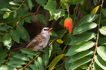 The Sooty-headed Bulbul Pycnonotus aurigaster bird feeding the fruit peel
