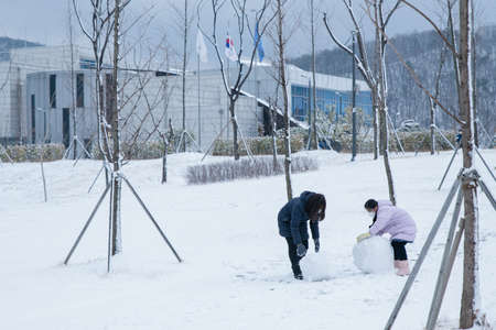 Crowded of tourists enjoy the activities in Jisan Forest Ski Resort in Seoul, South Korea