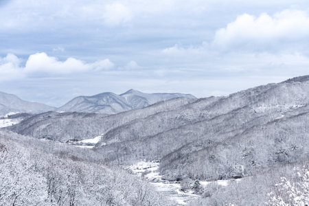 Panoramic view of Anbandegi mountain village at winter in Gangneung, Korea
