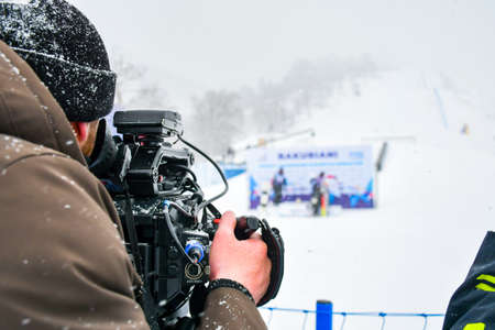 Camera operator film ski competition in ski resort in extreme snowy cold conditions