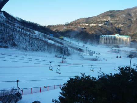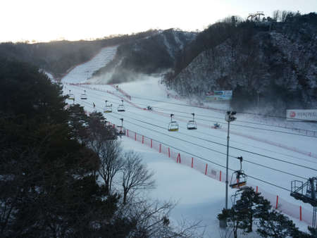HONGCHEON, SOUTH KOREA - MARCH 7: Gondola ski lift taking skiers up to the top at Vivaldi Park Ski World in Hongcheon city, Gangwon Province, South Korea on March 7, 2014.