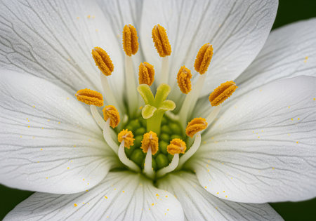 White flower in extreme macro close up, showcasing delicate petals, prominent yellow stamens, and a green pistil. botanical detail for nature, science, and beauty concepts.
