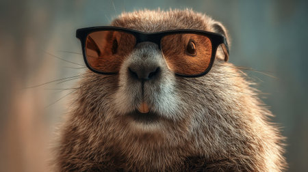 A small animal with sunglasses on its face. The sunglasses are black and the animal is brown. The animal is looking at the camera