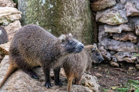 Cuban huts are endemic to the fauna, large rodents from the order of tail-tailed, against the background of stones and soil
