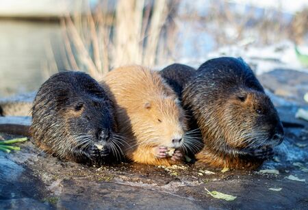 Small nutria eat vegetables on the banks of the river, close-up