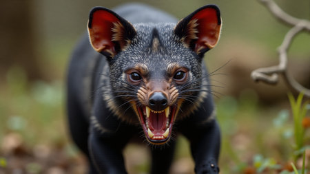 Tasmanian devil roaring in the forest. Tasmanian devil
