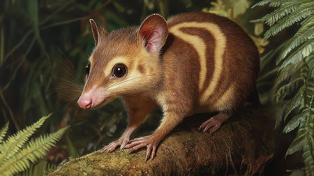 A close-up view of a charming bandicoot showcasing its distinctive stripes and soft fur, set against a backdrop of lush greenery and ferns.