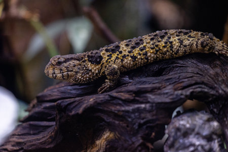 A beautiful, brown lizard living in the terrarium. An exotic scenery in aquazoo in Dusseldorf, Germany.