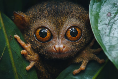This captivating close-up image features a colorful caterpillar perched on a textured surface, showcasing its large, expressive eyes in a lush forest setting.