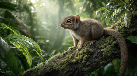 A lesser treeshrew Tupaia minor perched on a moss-covered branch in a lush green forest, surrounded by sunlight filtering through the foliage, showcasing its small size and detailed fur texture.