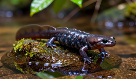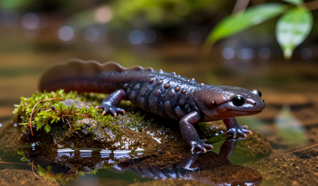 A striking black salamander is seen resting on a mossy rock in a calm forest stream. The gentle sunlight filters through the leaves, highlighting its shiny skin and serene surroundings.