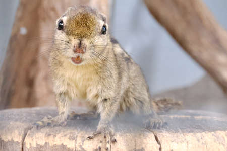 A striped rodents marmots chipmunks squirrel spotted on a tree trunk on hunting mood. Animal behavior themes. Focus on eye.