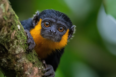 Close-up of a golden-mantled tamarin saguinus tripartitus, a small new world monkey clinging to a mossy branch in the amazon rainforest
