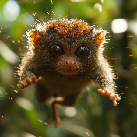 Baby tarsier leaping, jungle background, wildlife