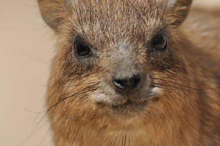 Daman siting on a stone and basking in the sun and looking friendly and with interest. Namibia. Africa.