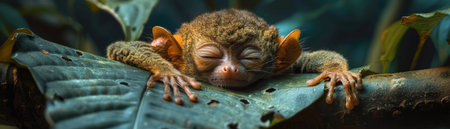 Witness the captivating charm of a nocturnal tarsier in this striking close-up Resting serenely on a leaf amidst lush jungle foliage, its mesmerizing eyes, delicate whiskers, and expressive face exude an adorable allure Observe the unique features that set these tiny primates apart, capturing their enigmatic nature within the dense vegetation of their natural habitat AI Generative