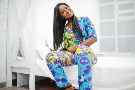 Elegance african american woman model wear in colored clothes. Chic afro women in room sitting on the bed.