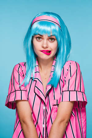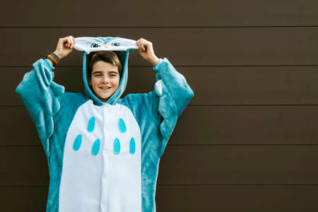 Happy teenage girl in funny nightclothes, pajamas cartoon style smiling, positive face expression, studio shot on blue.