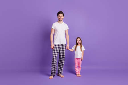 Full length body size view of her she his he nice lovely cheerful dad daughter holding hands wearing pijama isolated on bright vivid shine vibrant violet color background