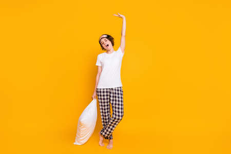 Full length photo of funny lady sleepy morning eyes closed enjoy saturday raise hands up stretching hold pillow wear white t-shirt plaid pajama pants isolated yellow color background