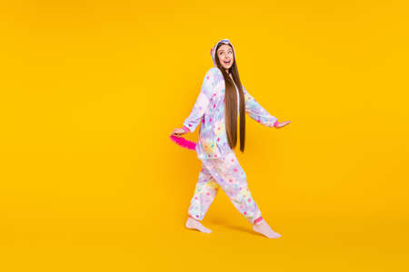 Full length body size photo girl wearing unicorn pajama walking keeping tail isolated vivid yellow color background