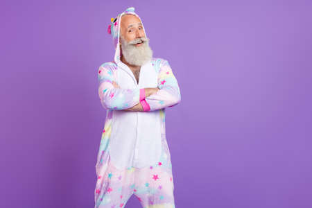 Full size photo of confident old man wear pajama look empty space hands folded isolated on purple color background