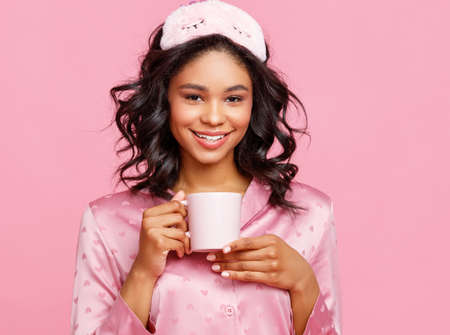 Delighted young ethnic woman in sleepwear smiling and looking at camera while enjoying coffee in morning against pink background
