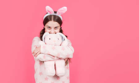 happy easter holiday. funny child in rabbit ears. smiling teenage girl in sleepwear. bunny hunt.