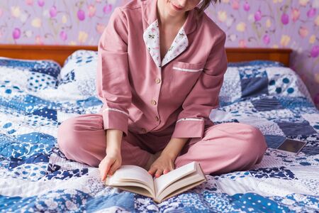 Happy woman wears pajama and relaxing at home and reading a book. Stay home. Quarantine pandemic coronavirus concept.