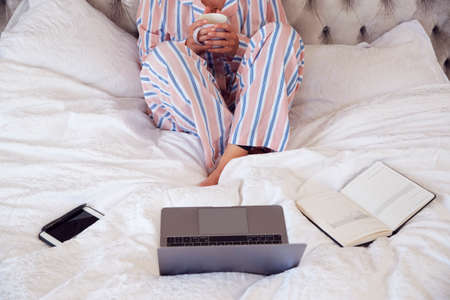 Close Up Of Woman Wearing Pyjamas Sitting On Bed With Laptop And Diary Working From Home