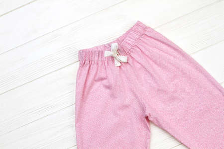 Cute pajama pants on wooden background. Elastic waistband and drawstring for snugly fit. Pink and white.
