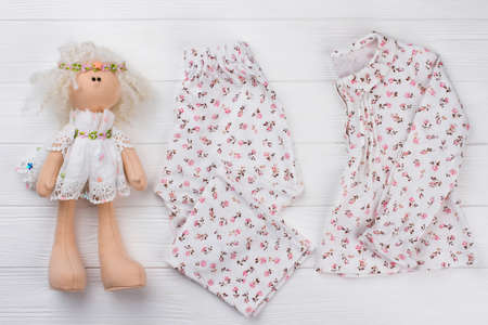 Favorite toy and childs pajama. Cozy material and floral pattern. Dolls and clothes from girls childhood.