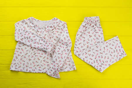 Floral top and pants on yellow table. Soft lightweight cotton for summer nights. Comfy and roomy pajama set for girls.