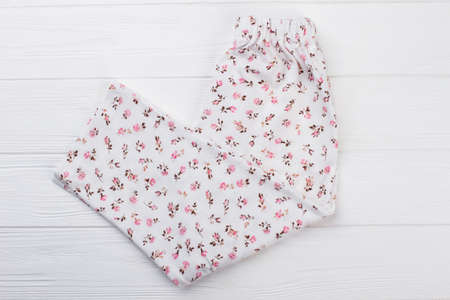 Girls pants on white wooden background. Cropped shot of clothes. Floral pattern. Discount sale, clothing collection.