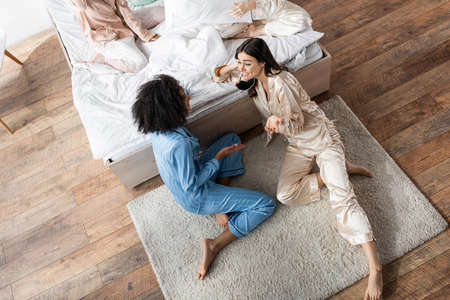 high angle view of african american woman sitting on carpet and talking with cheerful friend during slumber party