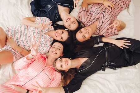 Top view relaxing young girl friends lying on bed having fun posing together